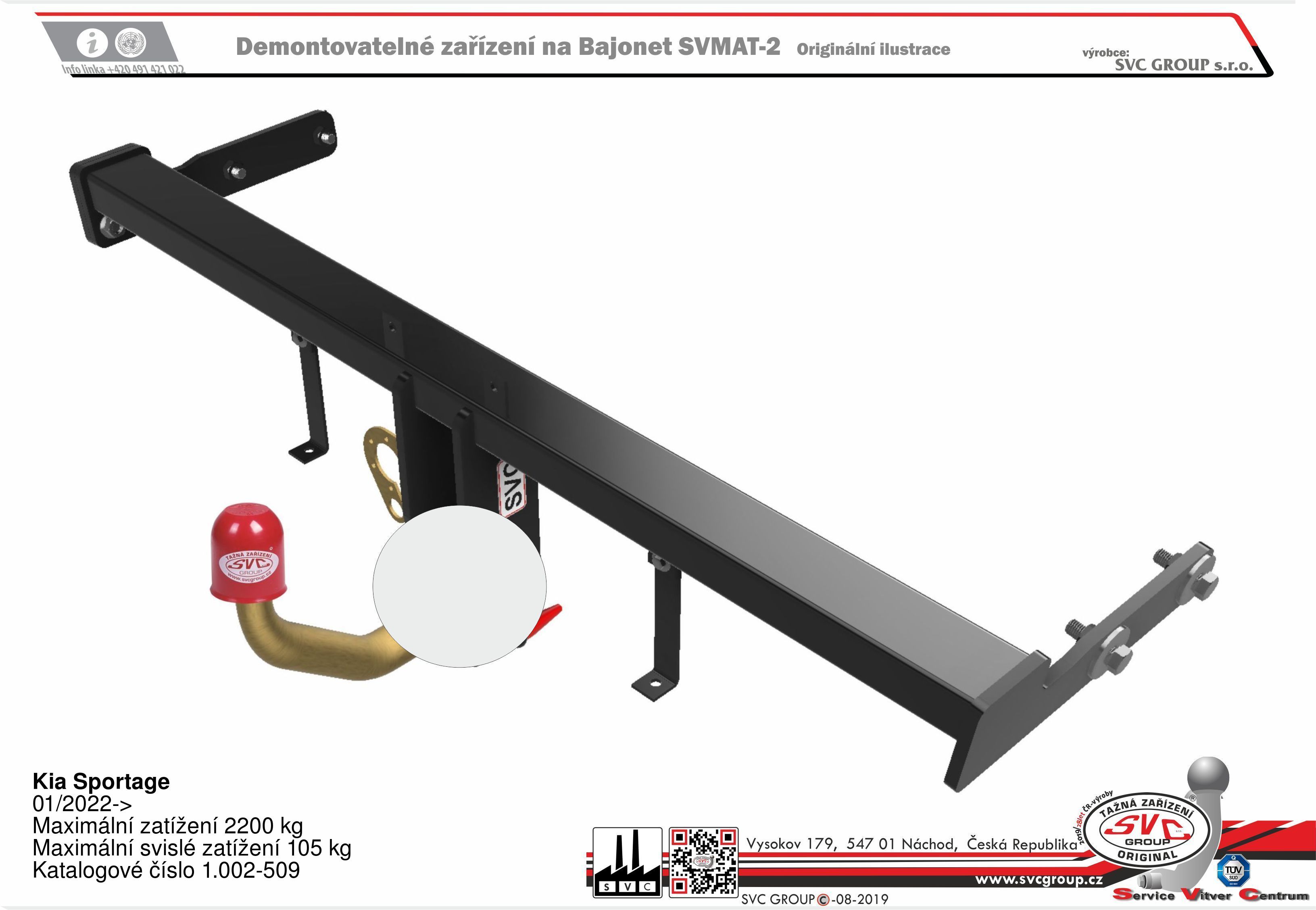 Výrobek je vyráběný dle požadavku vozu a Homologovaný pro prodej a provoz ve všech státech EU dle příslušných norem EHK-55R, podle zastaralé normy e94/20 zrušené již v roce 2016, která nesplňuje, dlouhodobě podmínky pro provoz nevyrábíme. Chráněný vzor SVC - bajonet SVMAT-2 je možné zaměnit za dvou šroubové provedení SVC, bez výměny tažného zařízení.
