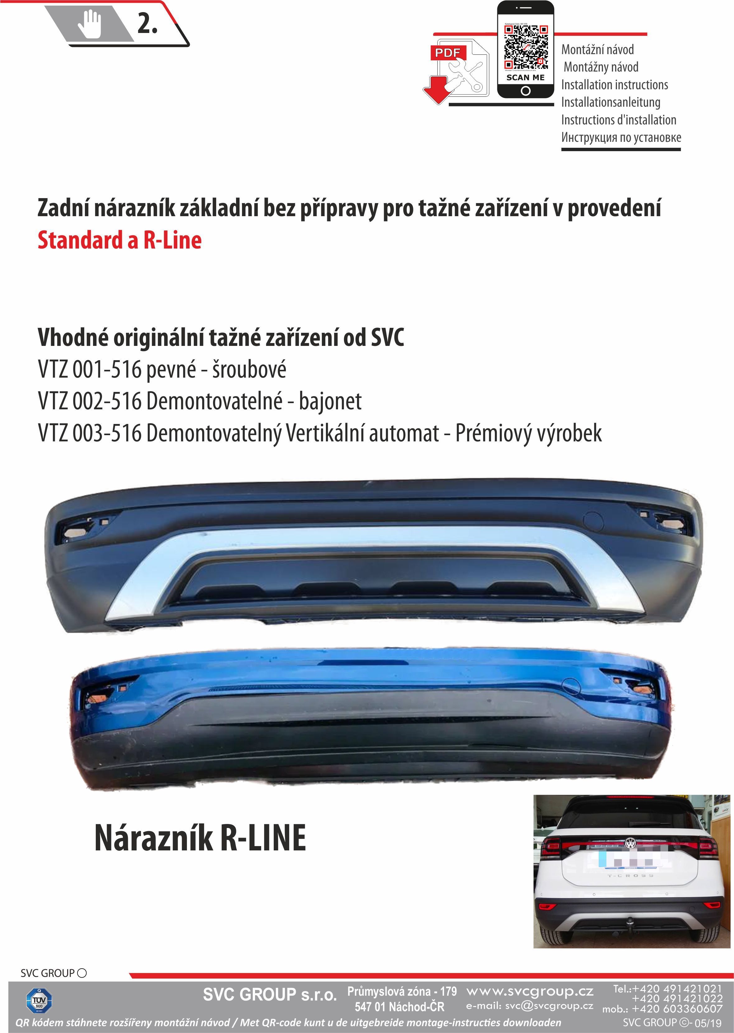 Včetně typu Standart a R-Line Tažné zařízení pro běžný a v základu prodávaný zadní nárazník. Nosník tažného plnohodnotně nahrazuje demontovanou výztuhu vozu z důvodu osazení tažným zařízením. Včetně užitkové verze, a 4-Motion (4x4). Né pro některé typy vozu s pohonem na CNG. Dodávka včetně přídavného držáku pro antény pod nárazníkem